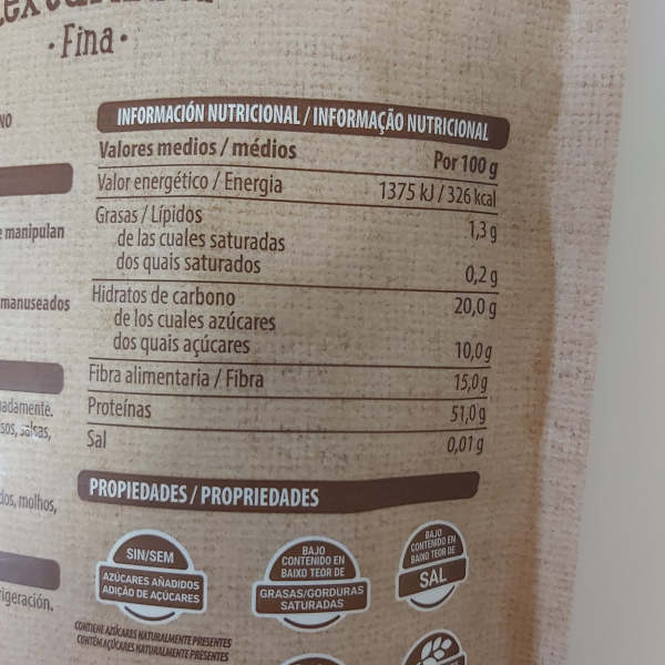 El producto viene en una bolsa de 250 gramos al precio de tan solo 1,50 euros. En cuanto a la información nutricional, es un 51% proteína, con un 15% de fibra, 20% hidratos de carbono y tan solo 1,3% grasa, siendo solamente el 0,2% grasa saturada.