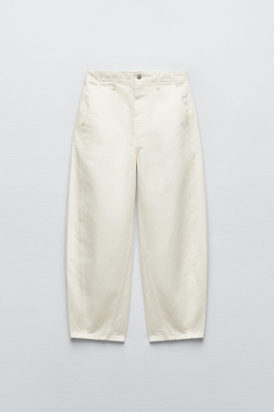 Los pitillos ya son historia, ahora se llevan los cortes relajados y cómodos. Estos jeans son la prueba de que se pueden llevar unos jeans sueltos y mantener la elegancia. Son de tiro alto, con pierna ancha tipo balloon leg, con parte de abajo ligeramente más estrecha. Lleva trabillas en la cintura y bolsillos en los lados y detrás. Son 100% algodón, es decir, no son elásticos. Llévate tu par en color crudo por un precio de 35,95 euros.
