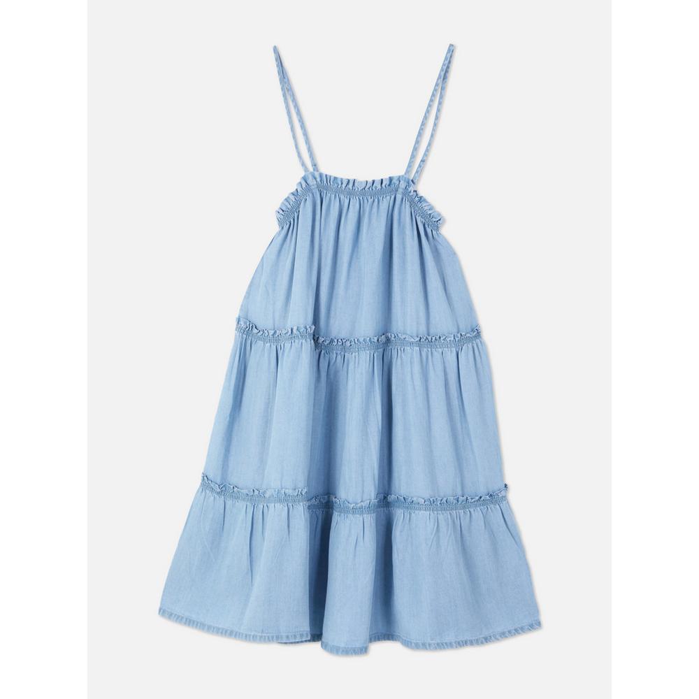 Empezamos con este vestido corto vaquero con diseño escalonado. Se trata de una prenda de tirantes, con un diseño de tela vaquera y escalonado, es decir, que se divide en varias partes, como si fueran escaleras. Esto divide el vestido en 3 partes diferenciadas donde hay un bordado, como si fuera una bandera.