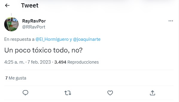 A todas estas, el usuario de Twitter de nombre RayRAvPor, al ver la entrevista hecha en El Hormiguero, hizo un comentario que nos parece acertado, al decir que piensa que todo es un poco tóxico y a nosotros nos parece que así es. De hecho, no debe ser muy sano estar discutiendo todo el tiempo ni coartando libertades, así que un poco toxica sí que parece la relación de Joaquín con Susana Saborido, a menos que se trate de un libreto bien ensayado para hacer reír a la audiencia, y lo decimos sin querer ofender.