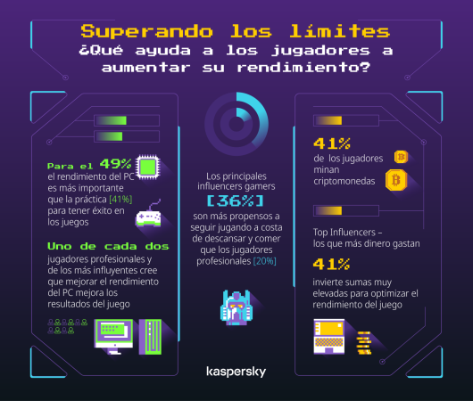 Sin embargo, el público gaming no está de acuerdo en estos apartados, ya que consideran que lo primordial es conseguir un PC potente (39%), el bienestar del propio jugador (37%) y el ancho de banda, además de tener las suficientes horas de juego (36%). La vicepresidenta de Marketing de Productos de Consumo de Kaspersky, Marina Titova, subrayó que «el resultado final de las partidas depende de múltiples factores, además de la potencia de procesamiento del ordenador, por lo tanto, los jugadores aprovecharán todas las posibilidades y oportunidades para ser los mejores en lo que hacen.