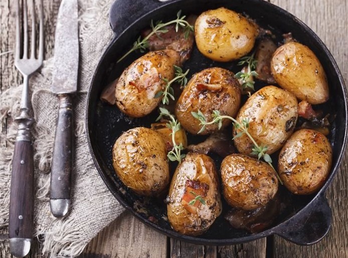 Agrega las patatas al sartén con el ajo y las hojas de laurel. Cúbrelas con agua hasta que las patatas estén sumergidas. Agrega sal y cocina a fuego medio durante 30 minutos o hasta que estén tiernas. Verás que la mayor parte del agua se ha evaporado y la sal ha formado una capa blanquecina alrededor de las patatas: esto es lo que les da ese sabor tan rico.