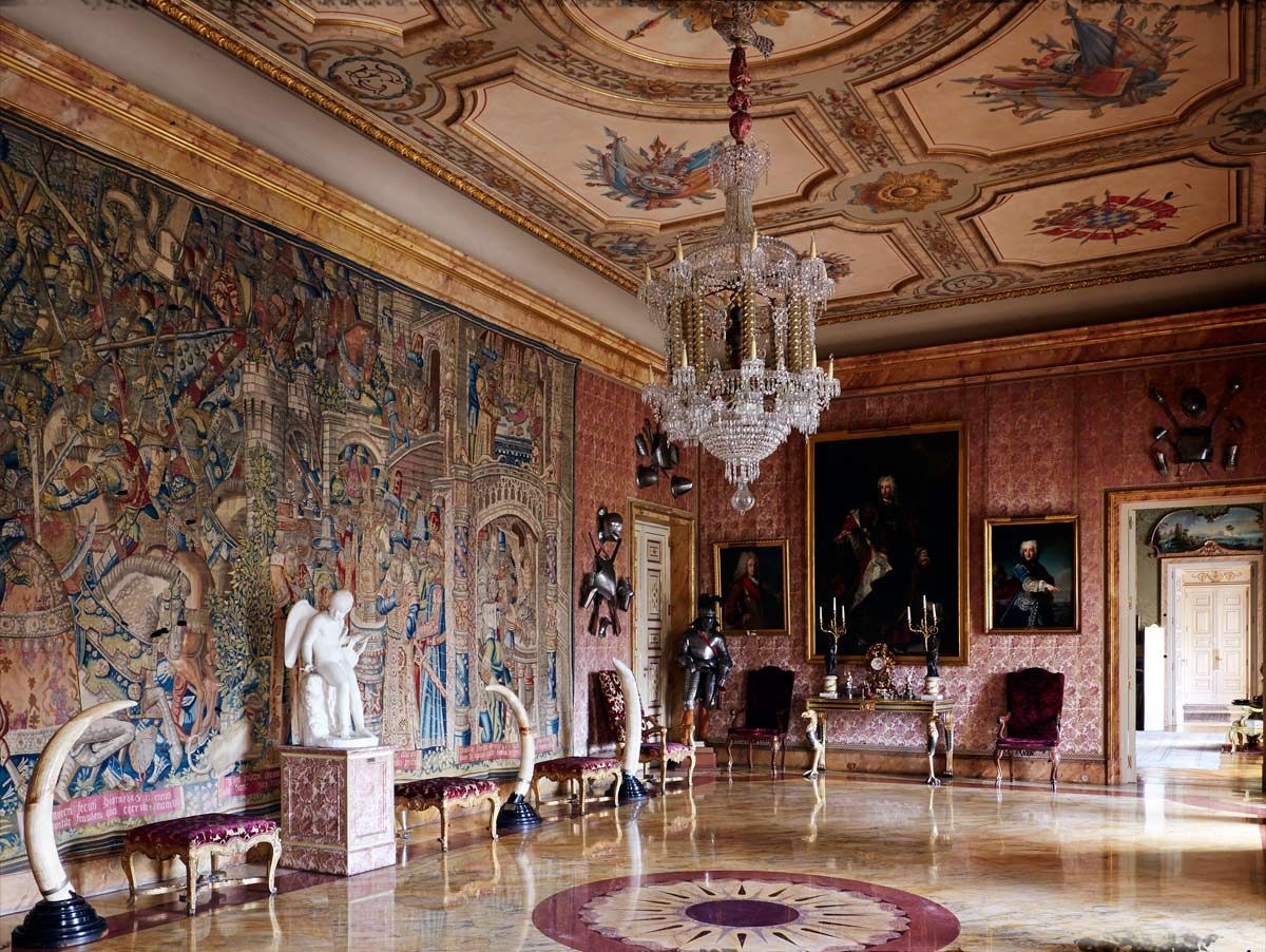 Esta sala de recepción es una de las más grandes del palacio, con una altura de casi 10 metros. Está decorada con pinturas de los duques de Alba, así como con una gran cantidad de espejos. Estos espejos se encuentran en todas las paredes de la sala, creando un efecto de profundidad y amplitud. Además, hay una gran cantidad de muebles antiguos, como sillas, mesas y sillones, que dan a la sala un toque de lujo y elegancia.