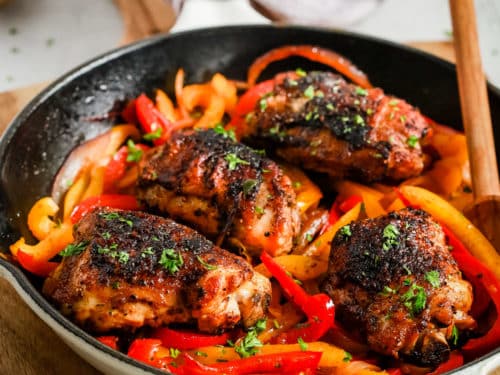 Una vez el pollo empiece a tener buen aspecto, se le suman los pimientos que ya habíamos asado con antelación, así como los ajos. Solo que estos últimos, pasados por el aceite al principio del plato, sí deben estar pelados en esta ocasión.