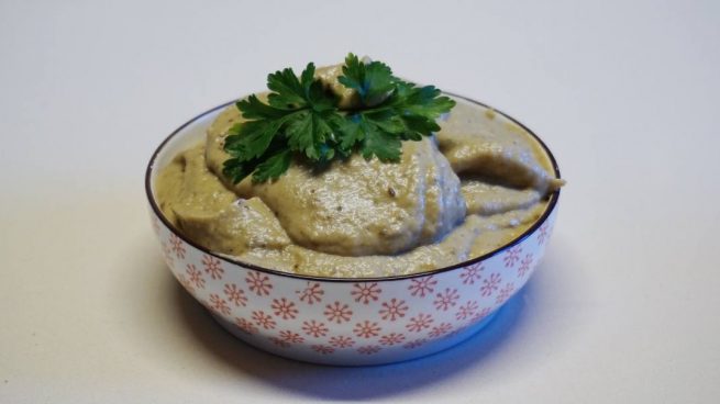 Mientras tanto nos ponemos con la crema de berenjena. Lavamos y troceamos el puerro y la berenjena y los pechamos en una sartén con un chorro de aceite de oliva. Cuando estén blandos, añadimos la pulpa del ajo asado e incorporamos el caldo de verduras. Dejamos cocinar unos 5 minutos, retiramos del fuego y añadimos es queso crema. Trituramos todo junto con una batidora y finalizamos con un poco de nuez moscada. Si se desea una textura un poco más cremosa, se puede añadir un chorizo de nata de cocinar. Ya tenemos la salsa lista.