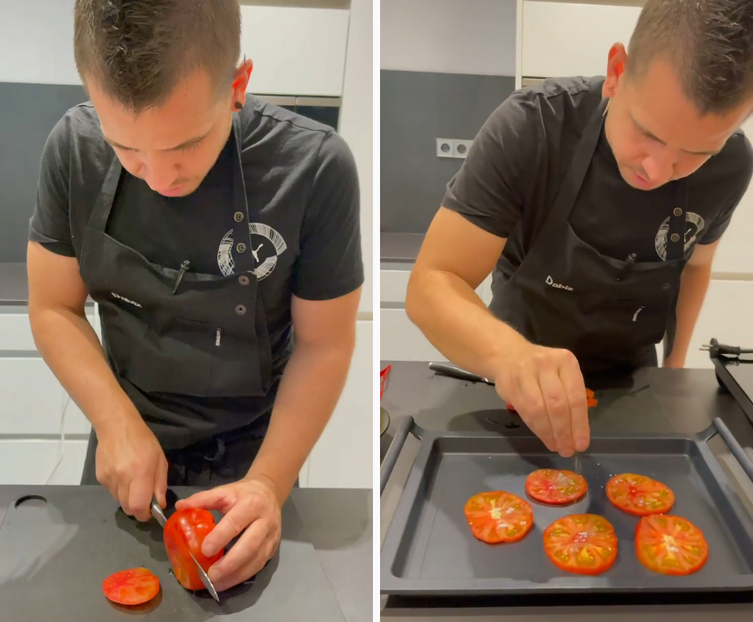 Primero, precalienta el horno con una bandeja a altura media. Debes lavar el tomate y cortarlo en rodajas, salpimentarlas y ponerles un poco de aceite antes de colocarlas en el horno. Dabiz Muñoz recomienda calentar 10 minutos cada cara de la rodaja hasta que tengan una textura cremosa, sácalas y dejan que se enfríen a temperatura ambiente. Lo siguiente es cortar en dados muy pequeños la cebolla y el pepinillo.