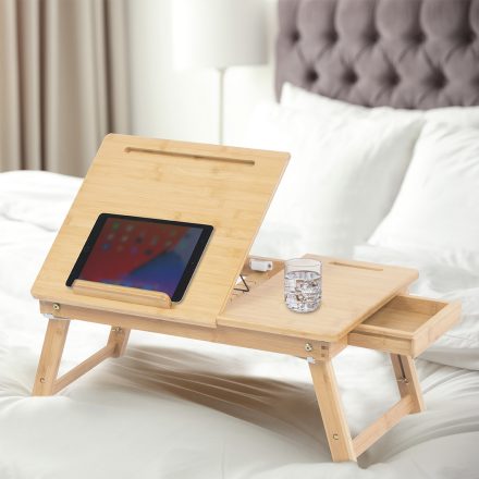 Mejora tu comodidad en casa con esta completa bandeja hecha con madera de bambú, un material higiénico, resistente y duradero. Tiene un tamaño de 68 x 54,5 x 34,5 cm y cuenta con dos patas para mantener la bandeja elevada, un cajón lateral y un soporte inclinable para usar como atril, para la tablet o un libro. La puedes conseguir en Aldi en color natural o en blanco. El precio es de 19,99 euros.