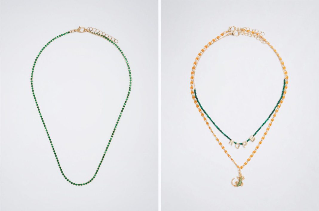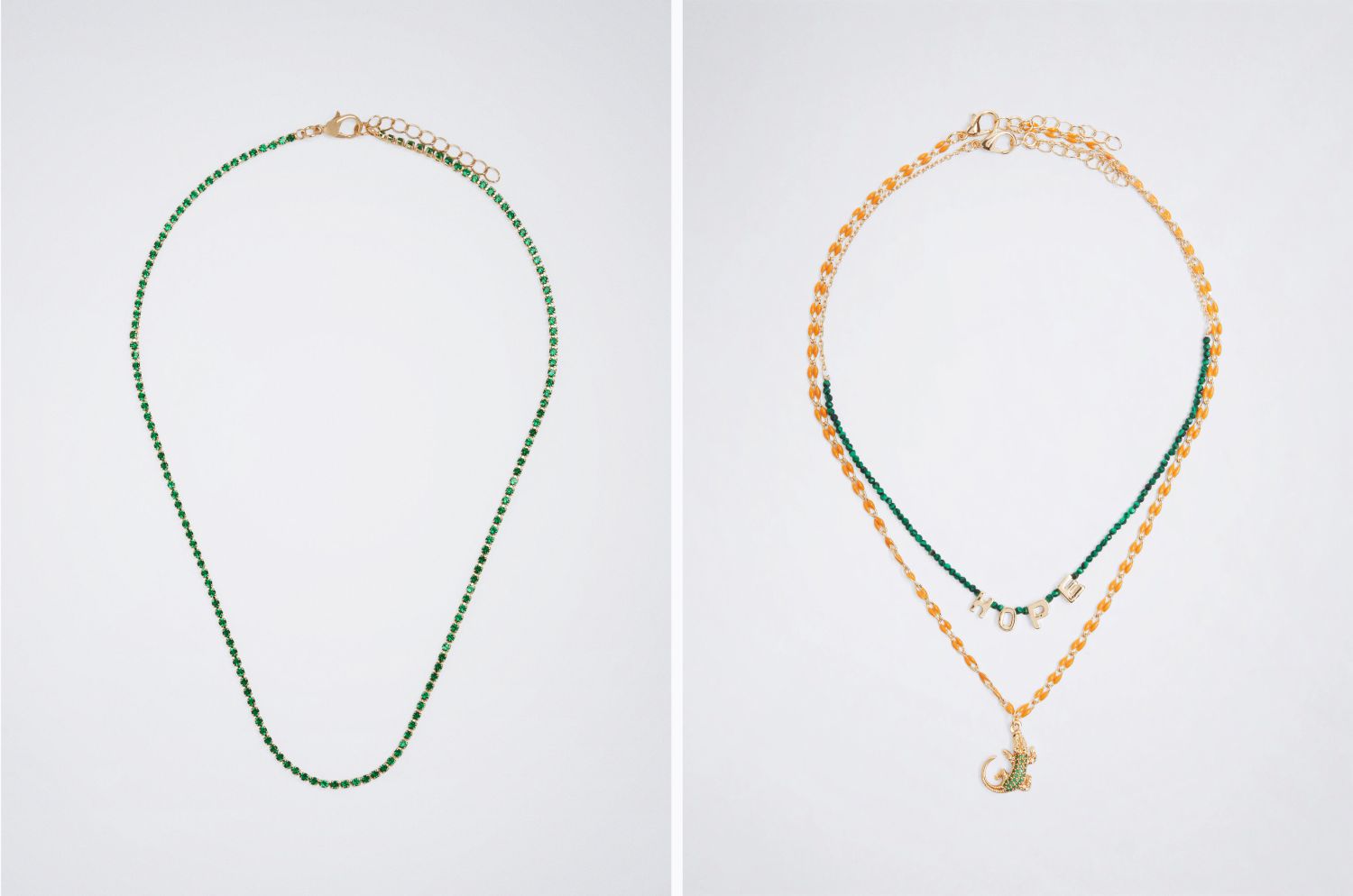 ¿A quién no le va encantar lucir unos diamantes? No te preocupes por el desembolso, ya que estos collares de Parfois eligen la alternativa de las circonitas, igual de distinguidas pero mucho más asequibles. Luce este modelo a 9,99 €, en verde coral indicado para ocasiones formales, gracias a su esbelta cadena con cierre en dorado. Para hacerle el regalo perfecto a una chica joven, quizás quieras prefieras el conjunto de collares con charm de lagarto y la palabra Hope, “esperanza”), que por su precio 12,99 € es uno de los más vendidos en Parfois.