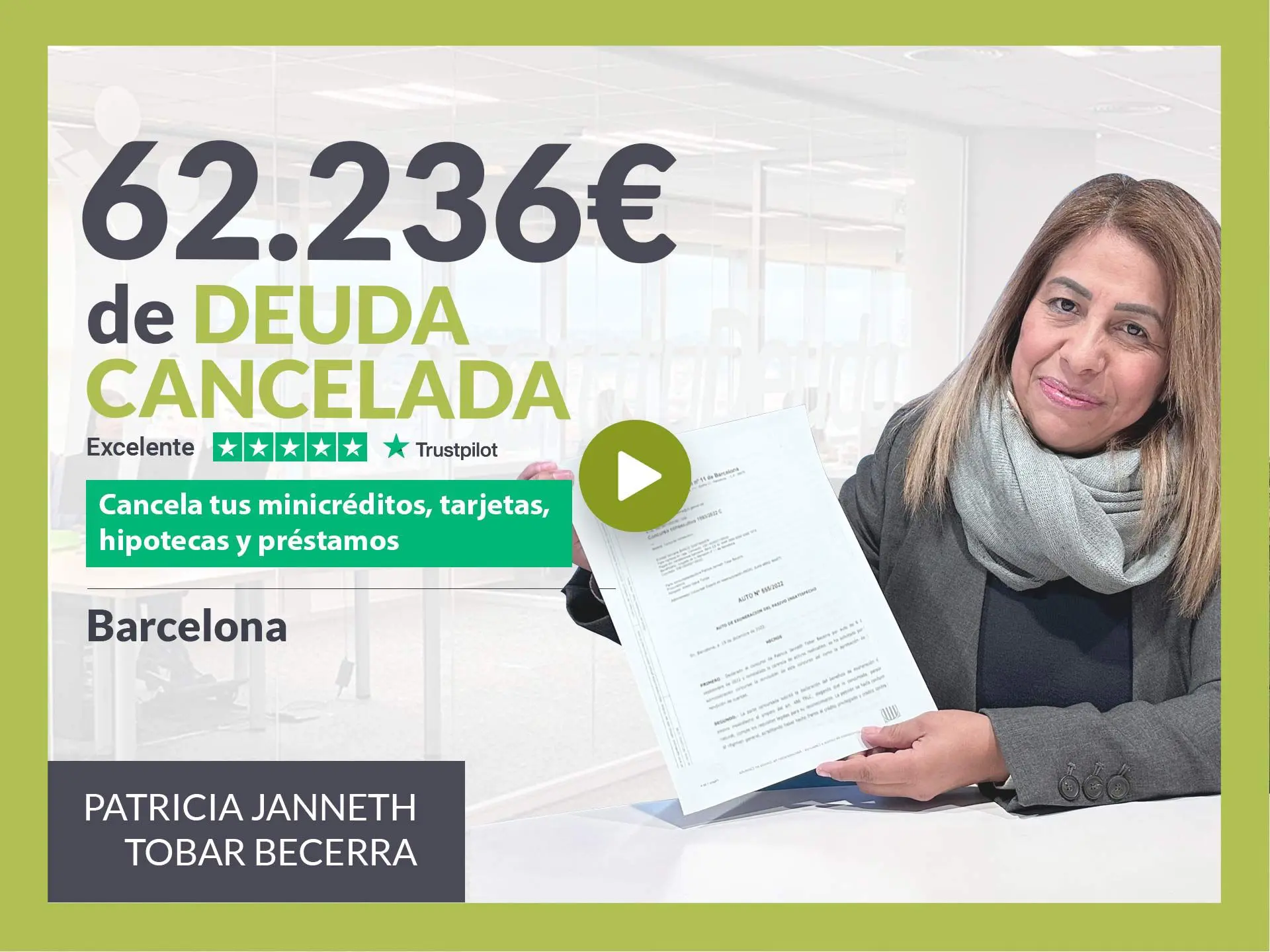 Repara tu Deuda Abogados, despacho de abogados líder en España en la tramitación de la Ley de Segunda Oportunidad, ha logrado otra cancelación de deuda en Barcelona (Catalunya). Mediante la gestión de Repara tu Deuda Abogados, el Juzgado de lo Mercantil nº11 de Barcelona (Catalunya) ha dictado exoneración del pasivo insatisfecho en el caso de Patricia Tobar, que había acumulado una deuda de 62.236 euros a la que no podía hacer frente. VER SENTENCIA