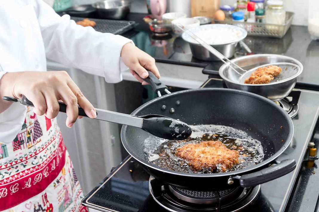 Escalda las hojas de espinacas y deja que se enfríen con agua y hielo, luego escúrrelas y tritúralas para hacer una crema verde que has de reservar con tu sopa. A continuación coge la harina, el trisol, los dos huevos y tritúralo todo bien. Echa un tazón de aceite de girasol en la sartén, añade la leche y los ingredientes y fríe todo a 170 grados, que es potencia alta en la vitrocerámica.