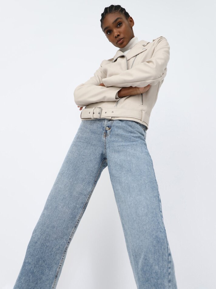La ropa que imita la piel sin estar hecha de ella también es tendencia. Para darse cuenta solo hace falta fijarse en lanzamientos como esta cazadora cruzada, disponible en dos colores, pero especialmente llamativa en este tono beige.