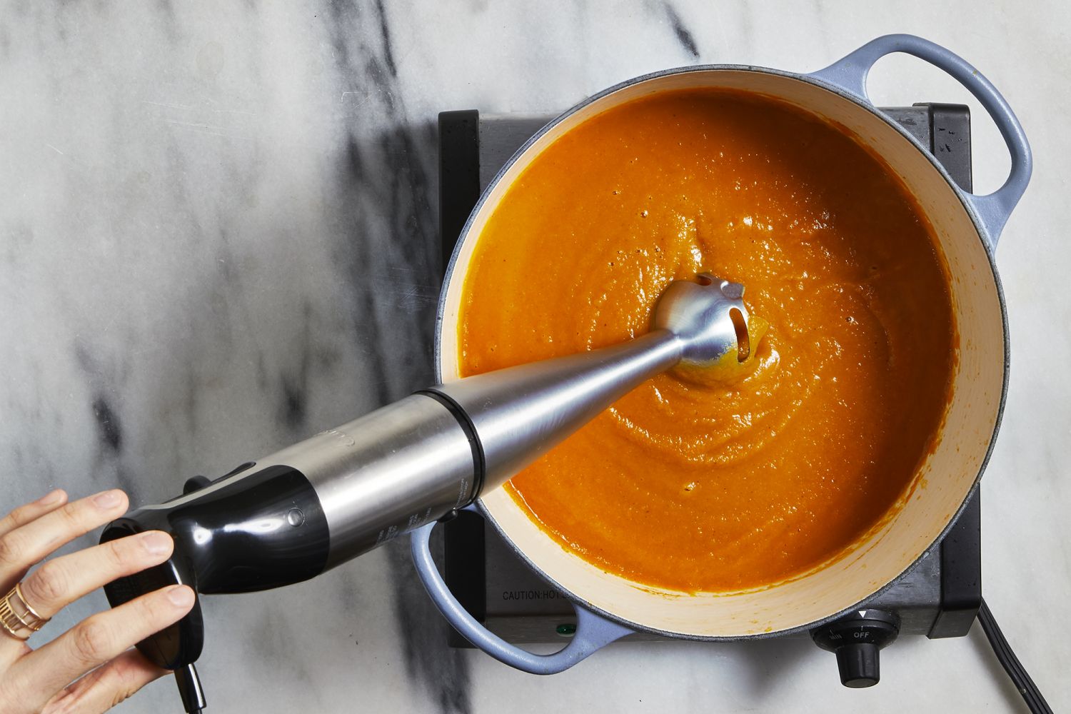 Apaga el fuego de la cacerola y, sin sacar las verduras de su interior, tritura todo con una batidora a potencia media. Tómate tu tiempo para que la mezcla quede cremosa, homogénea y sobre todo sin grumos. Al terminar pásalo por un colador y resérvalo, pero si quieres conseguir una textura más suave, sigue el consejo que te damos a continuación.