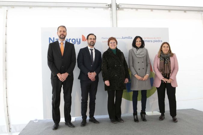 La alcaldesa de Jumilla, Juana Guardiola, presidió el acto de puesta de la primera piedra de la planta fotovoltaica de Jumilla esta semana, junto con la consejera de Empresa, Economía Social y Autónomos Valle Miguélez, el responsable de Desarrollo de Negocio Iberia de Naturgy, Juan Ferrero; la responsable de Construcción de la compañía, Elisa Ferrando; y el delegado de Desarrollo de Renovables de Naturgy en Murcia, Sergio Cardiel.