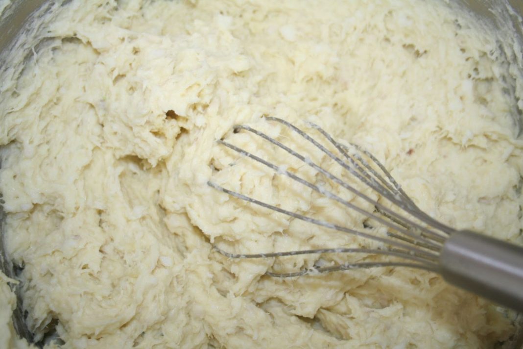 Una vez el bacalao y las patatas estén bien hervidos, echa todo en un vaso americano, junto con el espesante xantana, gluco y unas hojas de perejil. Ahora usa la batidora para conseguir una crema homogénea, que es la brandada de Quique Dacosta para estos buñuelos. Deja que la mezcla repose en el frigorífico.