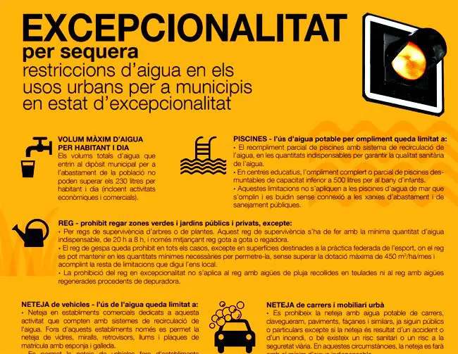 En caso de un empeoramiento de la situación de sequía, la ACA podría declarar la fase de emergencia, la más extrema de todas. Este escenario prevé un encarecemiento del precio de cada metro cúbico de agua se consuma de más, hasta alcanzar los 0,60 euros, estableciendo una dotación máxima de 200 litros por habitante y día, que puede bajar hasta los 160 en caso de emergencia extrema.