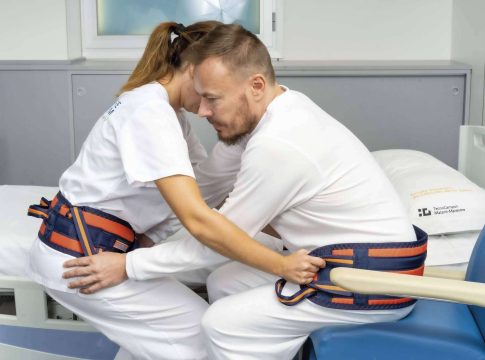 Entre las soluciones ofrecidas, se encuentra el cinturón de movilización, un dispositivo clave para terapeutas y cuidadores en las tareas de transferencia de pacientes de forma segura y controlada, reduciendo al mínimo el riesgo de lesiones del cuidador y del paciente.