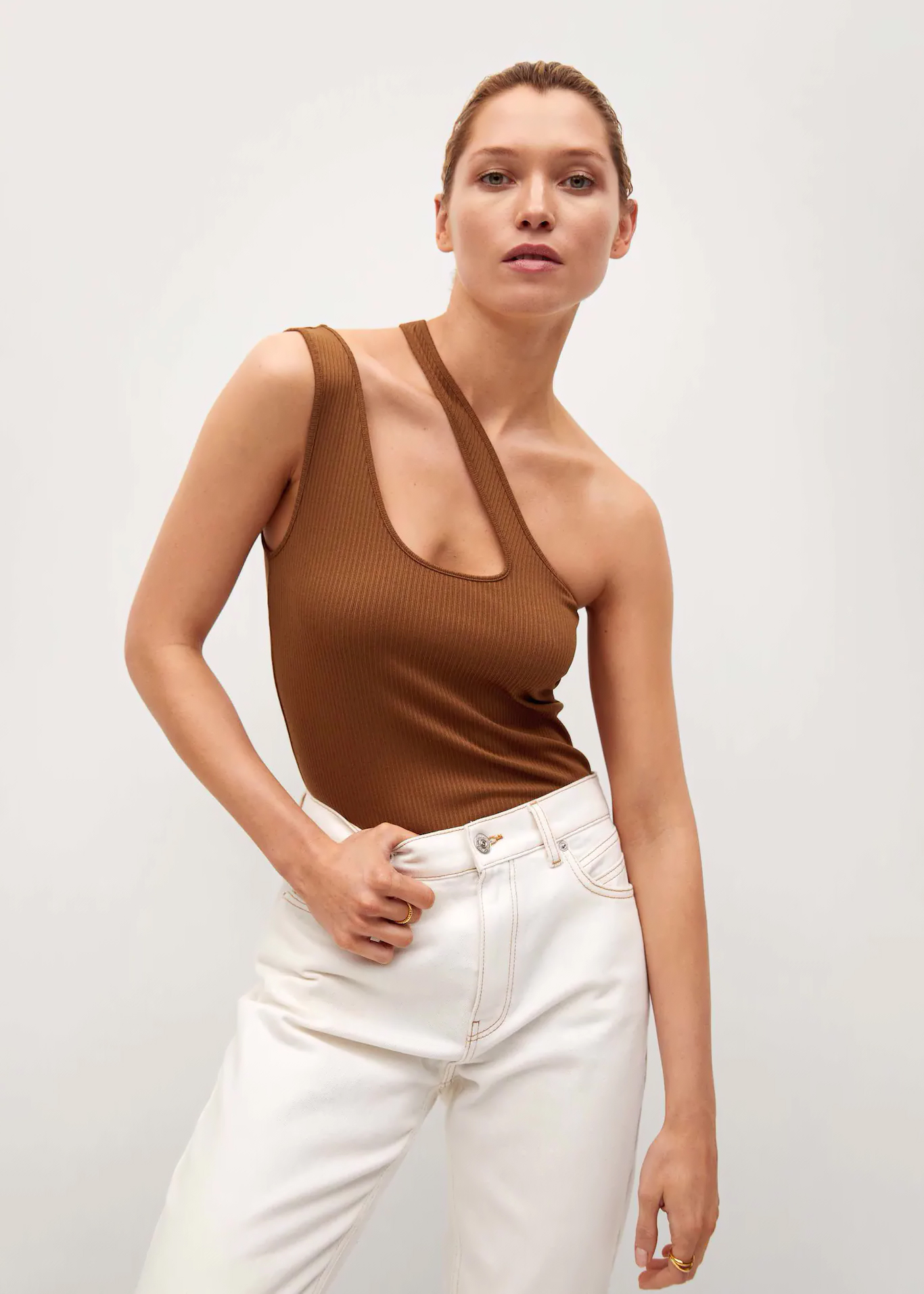 Disponible en tonos nude, negro y naranja tostado, este top ajustado tiene un escote asimétrico con doble tira que resulta rompedor y novedoso. Viene en tallas XS a XL, y su precio actual es de sólo 5,99 euros en el outlet de Mango. Su diseño entallado cut-out se ha convertido en una de las tendencias más habituales entre influencers y modelos de pasarela.