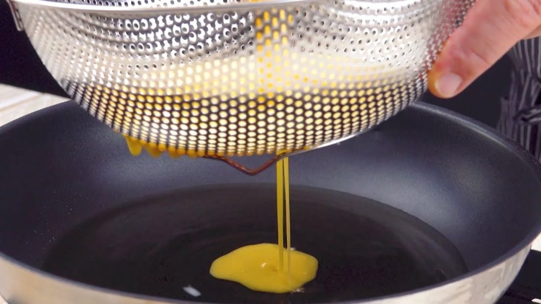 Después de añadir el agua de azahar a la mezcla del tocinillo de cielo, pásala por un colador mientras la viertes en una fuente pequeña. Pon la olla al fuego, pero usando como soporte unos moldes de metal, después coloca la fuente encima del soporte y cúbrela con agua hasta la mitad.