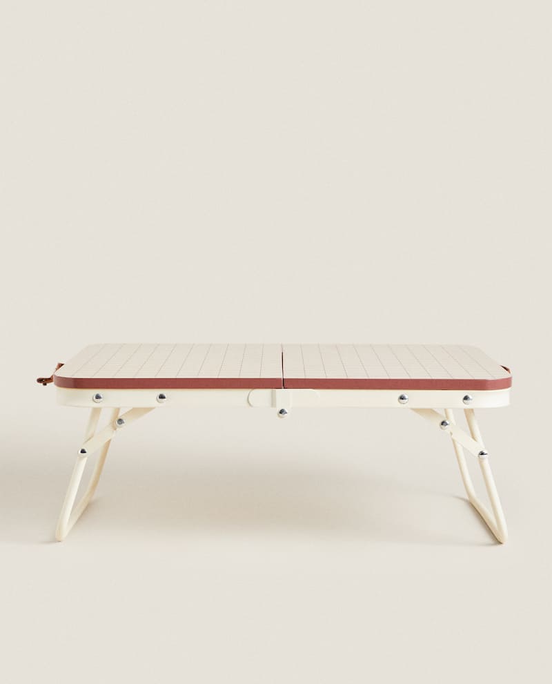 Este maletín plegable se trasforma en una mesita o bandeja con patas. Es un accesorio muy práctico para servir una merienda o un picoteo durante la proyección de la película. Tiene unas medias de 19x 35 x 26 cm (alto x ancho x fondo) y está hecho con hierro, en el soporte y fibra de madera en el tablero. Tiene un diseño retro de cuadros y tiene unas asas para transportarla una vez plegada. El precio en Zara Home es de 35,99 euros.