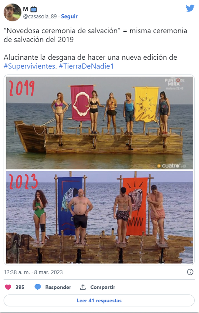Tan pronto como Supervivientes presumió de la “renovada” prueba de salvación, los fans del reality demostraron que era la misma prueba que se realizó en 2019, con el único cambio de que los nominados no pasaron por el barro. “Alucinante la desgana de hacer una nueva edición de Supervivientes”, comentaba un espectador en Twitter. A él se unieron comentarios criticando la publicidad engañosa del programa, e incluso hubo muchos que propusieron su cancelación inmediata.