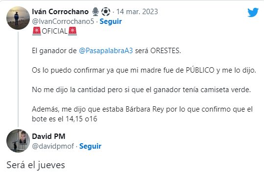 Suele pasar en realities o concursos: se filtra por interés o despiste quién se va de un reality o quién gana en un concurso. En ‘Pasapalabra’ no era la primera vez, y ya es casi tradición. Fue este pasado y reciente día 15, cuando todos elucubraban ya si el bote sería el jueves o viernes, cuando se filtró por qué sería el jueves. Fue en un tuit que rápidamente se borró y donde el hijo de una mujer que estaba entre el publico adelantó la primicia. Y todo porque estaba Bárbara Rey en plató el jueves pero el viernes ya no, con lo que se dedujo que sería el jueves.