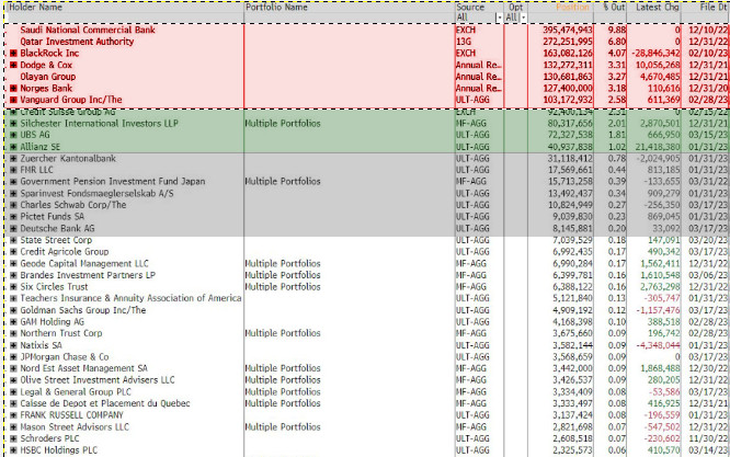 El banco nacional de Arabia Saudí ostenta el 9,88% del capital de Credit Suisse, unos 395,47 millones de acciones, mientras BlackRock tiene 163 millones, el 4,07% del capital, aunque de forma indirecta la posición de este último se sitúa en el 4,93%. Qtar Holdings, por su parte, ostenta el 5,03% desde noviembre de 2021, con 133,2 millones de títulos.