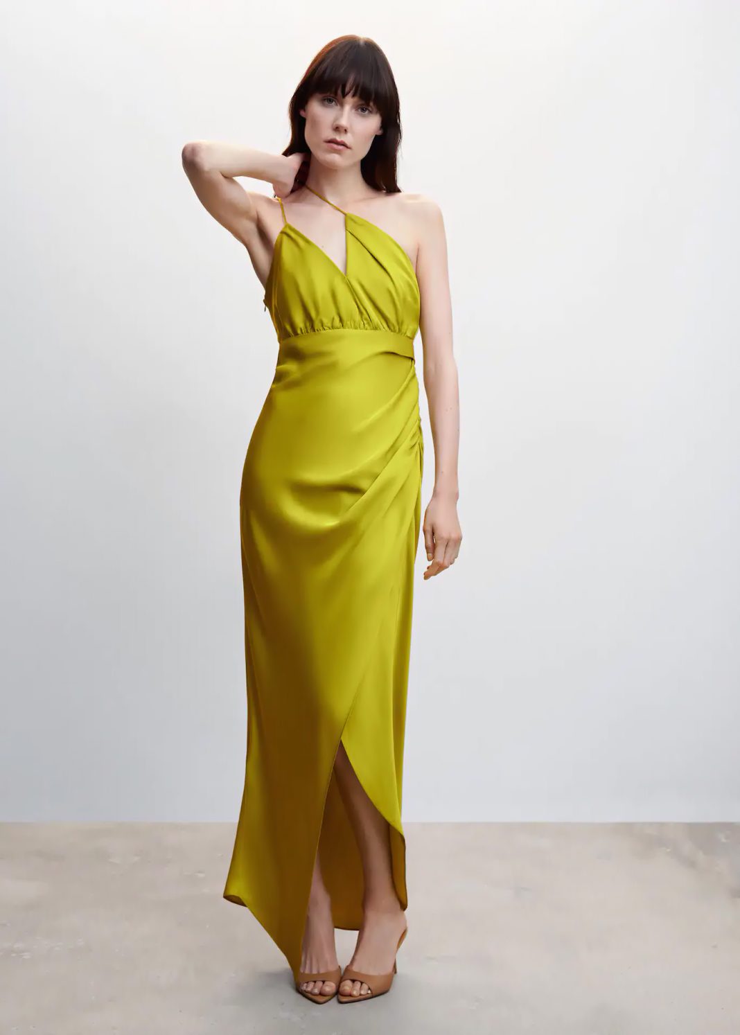 Nuestra propuesta favorita de Mango logrará que seas lo más comentado en una boda. Disponible en tallas XS a XL por 79,99 euros, este vestido color lima resalta tu figura con su diseño entallado, y su abertura en el bajo, por la parte delantera, es ideal para lucir tus piernas. Tiene además cuello y bajo asimétricos y detalles drapeados que resaltan el tejido satinado.