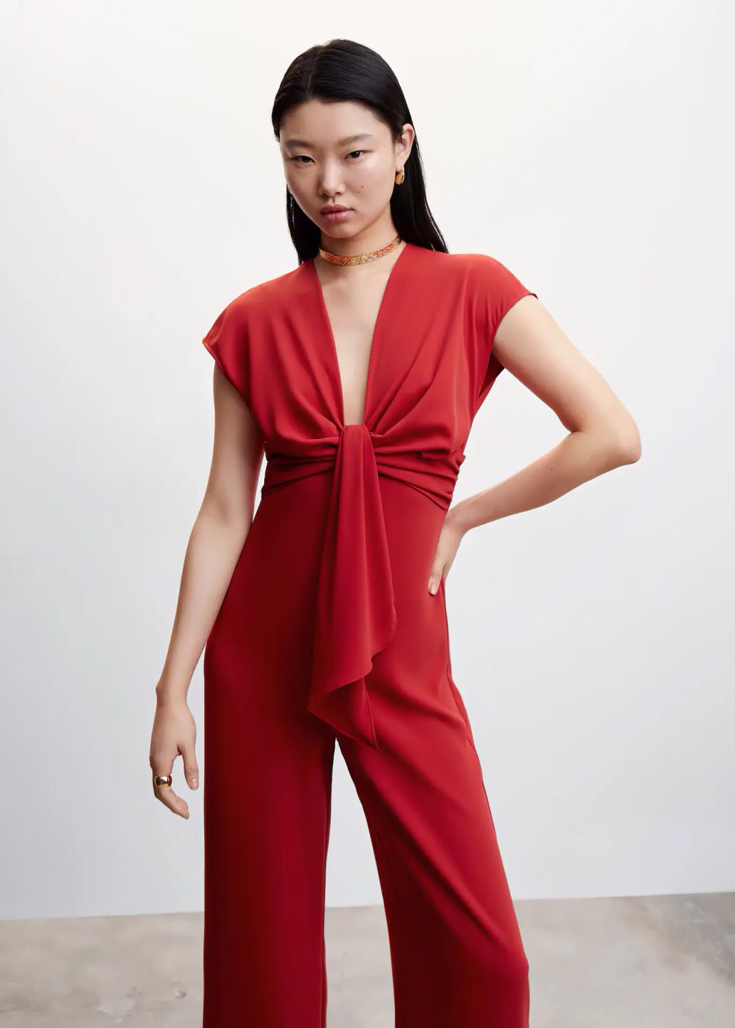 Una boda supone reencontrarse con viejas amistades y familiares, a quienes has de causar la mejor impresión posible. Transmite confianza y resolución gracias a este mono, que combina en una sola prenda modernidad, formalidad y sensualidad por medio de su cuello escotado, en colores fresa o negro. Tiene un diseño entallado que se adapta a tu cintura, un estiloso detalle de nudo y manga corta para ser lo más agradable posible. Mango quiere que te lo lleves por 49,99 euros, y puedes elegir entre las tallas XXS a XXL.