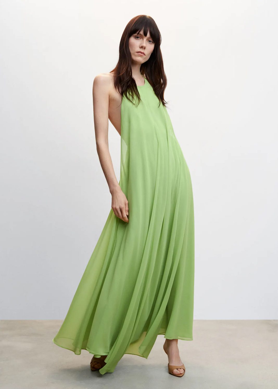 Nada atrae más elogios que un vestido de espalda abierta, la prenda perfecta para una boda veraniega. El modelo de Mango tiene un cuello redondo con tiras para lazo, tirantes finos y cintura con goma elástica, y su diseño acampanado se suma a un tejido fluido para ser fresco y cómodo. ¿Su precio? Tan solo 79,99 €, y en tallas XS a XL.