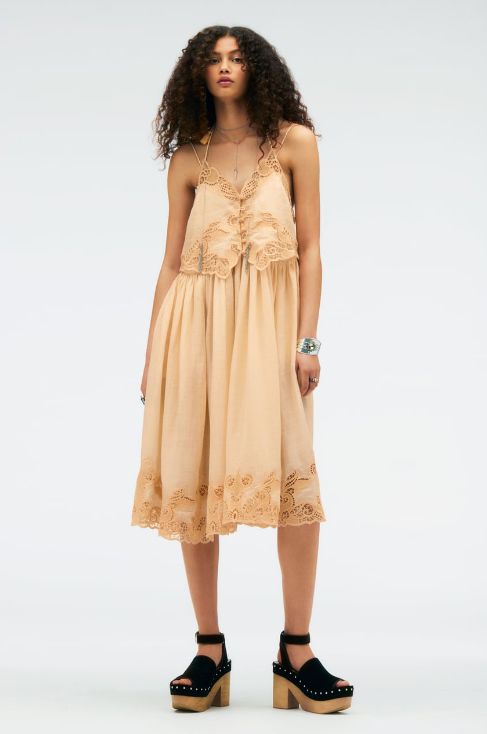 Este vestido en color melocotón es perfecto para dar un paseo después de un día de playa. Los tirantes aunque son finos se pueden ajustar con lazadas. Además, otro aspecto muy práctico de este vestido es que tiene bolsillos ocultos en los laterales. Se recomienda no lavar esta prenda en la lavadora para así evitar estropear los bordados. El largo del vestido llega hasta las rodillas. Esta prenda tiene el precio de 149€ y puedes combinarlo con unas sandalias oscuras para crear contraste.