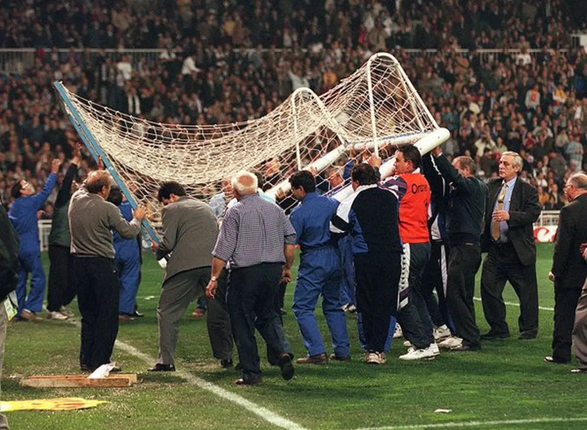 La imagen sigue siendo grotesca 30 años después. El mundo entero conoce el duelo Real Madrid-Dortmund por la caída de la portería situada en el fondo Sur del Santiago Bernabéu el 1 de abril de 1998. Fue una semifinal de la Champions apasionante, pero marcada por este hecho. El Madrid resolvió el asunto trayendo una portería que parecía de juguete, una portería Feber como dijeron muchos de los que tuvieron esta marca infantil como referencia. El 1 de abril se cumplirán 25 años de un encuentro que dejo al Madrid a dos pasos de romper con el maleficio de la Copa de Europa. Los hombres clave de este partido fueron Fernando Redondo, el cerebro del equipo, el más canchero, y Christian Karembeu, el autor de los dos lanzamientos menos ortodoxos vistos en la Liga de Campeones, pero, sin duda los dos más efectivos. Sus goles en cuartos de final ante el Leverkusen y en la semi ante el Dortmund, fueron clave para que el Madrid lograra el pase a la final. Teka patrocinaba entonces al real Madrid.