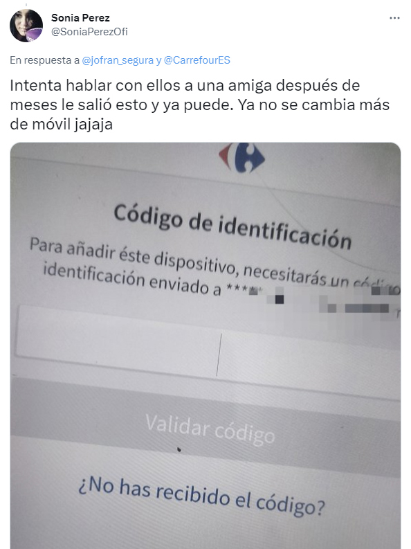 “Intenta hablar con ellos”, le decía la usuaria al cliente insatisfecho, a la vez que le mostraba la ‘solución’ de Carrefour: solicitar un código de autorización para entrar en la aplicación, que se enviará al móvil con el que te diste de alta. Un auténtico galimatías, que por suerte se solucionó para el cliente una vez actualizó la app.