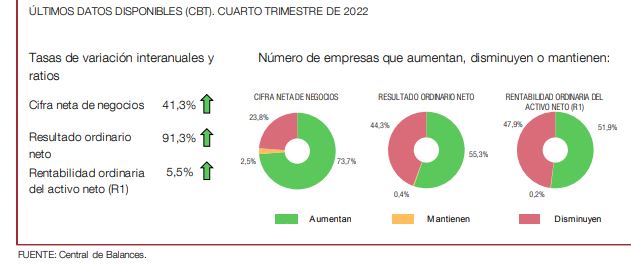 La ratio de rentabilidad del activo se situó en 5,5% en 2022 frente al 4% de 2021 (alza justificada principalmente por el incremento del RON). Destacó el aumento de las rentabilidades de los sectores de comercio y hostelería y de industria que duplicaron sus valores para el 2022 (de 6,9% a 11,2% y de 5,5% a un 10,9%, respectivamente), si bien en el caso de la industria este incremento vino marcado por la evolución expansiva del refino en el último ejercicio.
