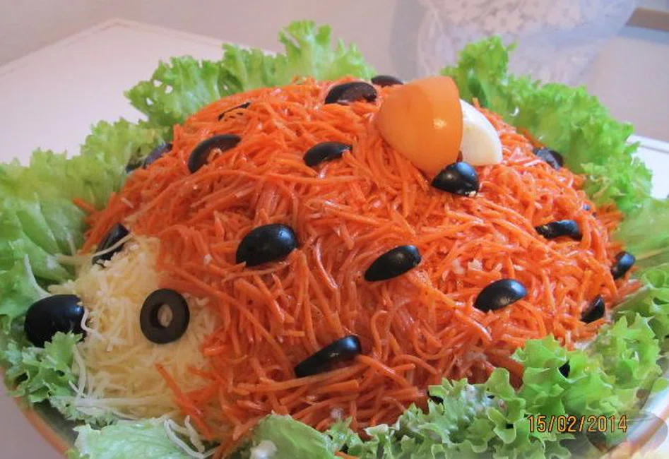 En la parte que serán los pinchos del erizo coloca una buena cantidad de zanahoria rallada, dejando libre la cara. Para homogeneizar la parte de la cara le puedes poner un poco de huevo rallado, así queda todo blanco. Luego solo necesitas poner los ojos y la nariz con ayuda de unas aceitunas negras.