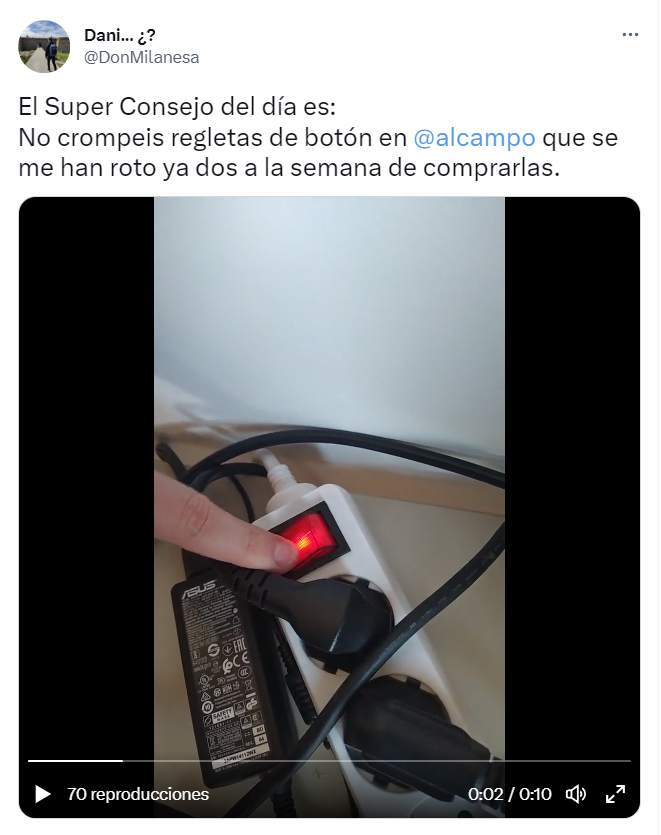 Este cliente insatisfecho se dirigía a la cuenta oficial de Alcampo en Twitter en estos términos: “no compréis regletas de botón en Alcampo, se me han roto dos en dos semanas”. Acompañaba su denuncia de un vídeo, en el que se ve cómo intenta apagar el botón de encendido de una regleta sin que la luz reaccione lo más mínimo. La queja de este usuario es más relevante si cabe, ya que las regletas son un dispositivo sometido a altos voltajes y un fallo puede provocar incendios.
