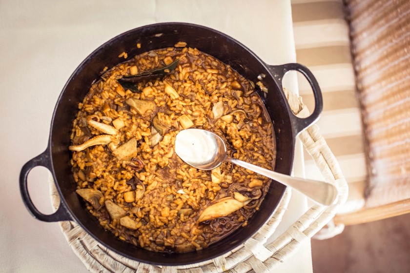 La receta de Jordi Cruz esta proporcionada generalmente para 4 o 5 personas, explica que después de que dore las gambas, se añaden la marca y la sepia. Luego para su humedad le incorporas el medio litro de agua, además del caldo ya previamente preparado y lo esparcirás todo muy bien, dejándolo cocinar.