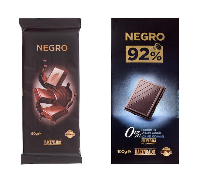 Es muy difícil resistirse a la tentación del chocolate negro extrafino Hacendado, sobre todo porque la unidad cuesta apenas 0,80 euros, pero te lo puedes pensar dos veces al saber que cada tableta contiene casi 800 kilocalorías. Si vas a comprar a Mercadona, te recomendamos que sustituyas este producto por el chocolate negro 92% cero azúcares. Cuesta el doble, 1,60 euros y sube hasta las 900 calorías, pero contiene fibra de achicoria que es buena para el tránsito intestinal.