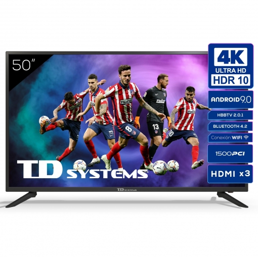 Empezamos fuerte con este televisor TD Systems K50DLG12US. Es un televisor de 50 pulgadas, resolución 4K, Smart TV con Android y tecnología HDR10. Viene con 3 puertos HDMI, 2 puertos USB, entrada de vídeo compuesto y vídeo por componentes, para que puedas conectar incluso dispositivos antiguos.