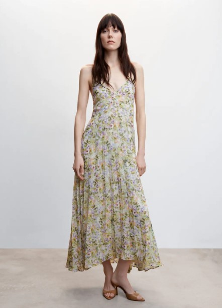 Si estás planeando unas vacaciones, asegúrate de incluir en tu equipaje un vestido con estampado de flores. Puedes encontrar un diseño elegante por 80 euros. Este vestido plisado de corte midi tiene un cuello de pico y tirantes finos que se cruzan en la parte trasera, dejando una abertura en la espalda.