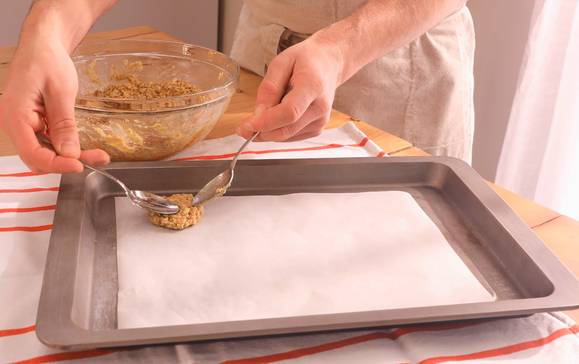 Ahora, según Karlos Arguiñano, coge porciones de masa con la cuchara y colócalas en una bandeja con papel de horno cuidando el espacio entre ellas. Aplana la superficie para dar forma de galleta.