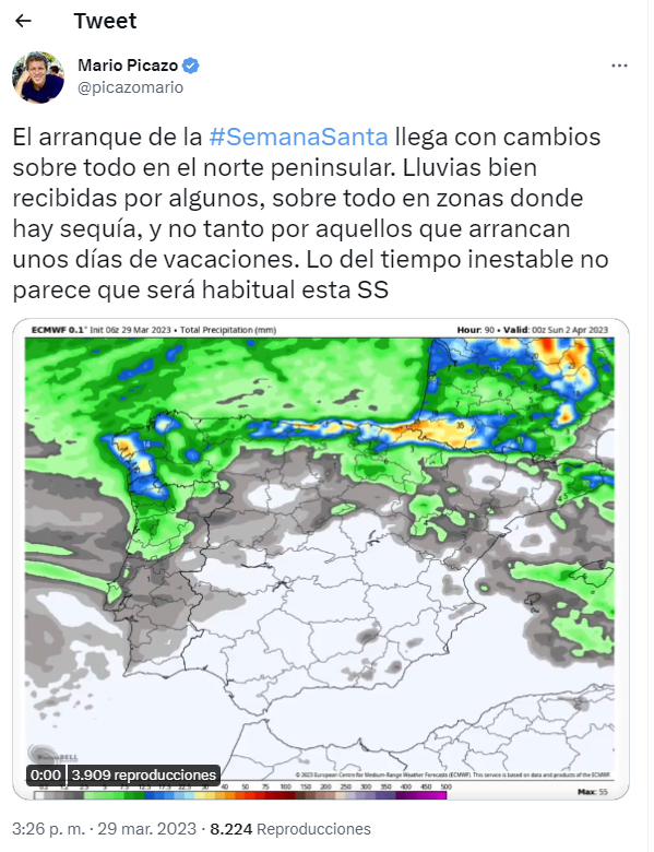 En su tuit más comentado, Mario Picazo anuncia cómo será el tiempo en Semana Santa: “El arranque de la Semana Santa llega con cambios sobre todo en el norte peninsular. Lo del tiempo inestable no parece que será habitual estos días”. El comentario del meteorólogo viene acompañado de un vídeo que muestra cómo un frente de nubes cubre poco a poco la parte norte de la Península, ¿pero qué puede significar?