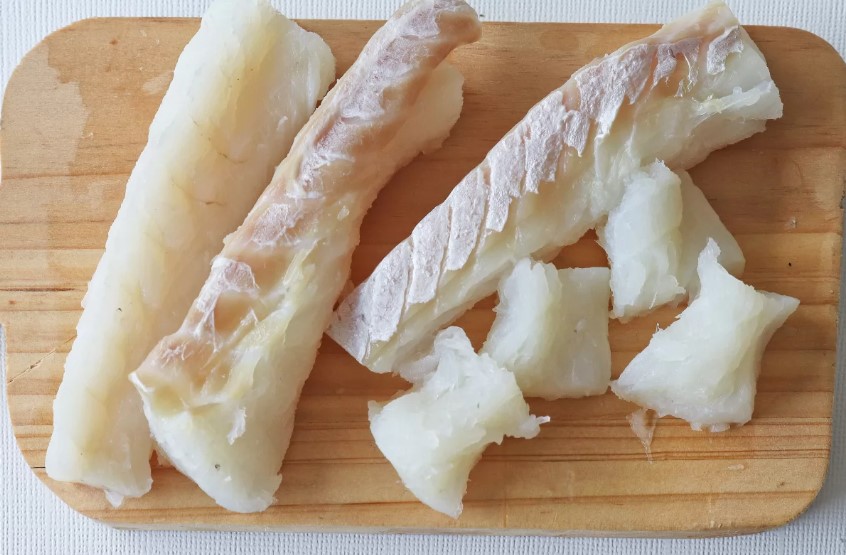 Aparte, se debe retirar la piel de 300 g de bacalao previamente desalado y se corta en trozos de tamaño uniforme. Por último, se agrega el bacalao al guiso, se tapa la cazuela y se cocina a fuego lento durante 10 minutos más junto con los demás ingredientes.