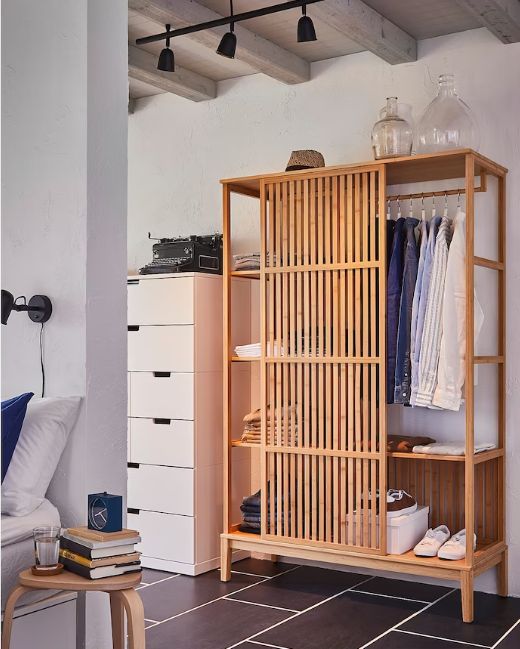 El armario Nordkisa está fabricado completamente de bambú haciendo de este armario una opción ligera pues es un tipo de madera que no pesa y sostenible. Este armario tiene una parte abierta con una puerta corredera por lo que también ofrece una parte de privacidad con la posibilidad de usar la parte abierta como estantería para exponer algún objeto de decoración. Las medidas de este armario es de 120 x 186 centímetros y cuesta 299€.