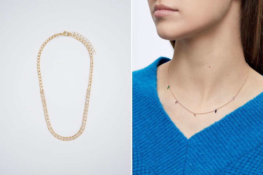 Los choker son la joya de moda entre famosas e influencers, y en Parfois encontrarás un modelo dorado con cristales que combina de maravilla con los pendientes, por sólo 9,99 euros. Si prefieres otro tipo de collar te recomendamos que sea uno fino para que siga el estilo del pendiente. Los modelos con flores y cristales y el collar con perla y corazones son una opción perfecta por apenas 9,99 €, y por un euro más dispones de un estupendo collar con circonitas.