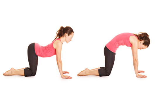 Inhale y deje que la espalda se arquee, levantando la cabeza y el coxis. A continuación, exhale mientras redondea la columna vertebral hacia el techo, tirando de los abdominales hacia la columna vertebral. Y, al mismo tiempo, metiendo el coxis y la barbilla hacia el pecho. Repita entre estas dos posiciones mientras inhala y exhala. Repita la operación durante un minuto. Perfectoaliviar el dolor de cabeza.