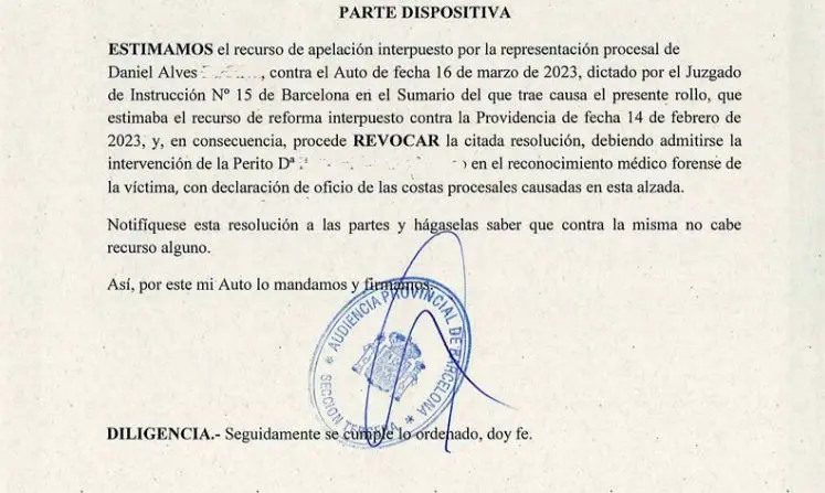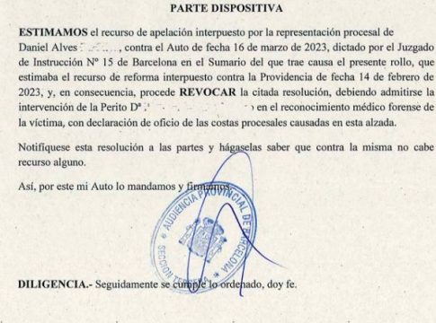 La sección tercera de la Audiencia de Barcelona ha estimado el recurso de apelación que presentó el bufete que representa a Dani Alves y ha autorizado la intervención de una perito designada por la defensa en el reconocimiento médico-forense que debe realizarse a la denunciante, según ha publicado ‘La Vanguardia’.