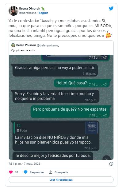 En la conversación que Belén compartió, se discutía la asistencia de los niños a una boda y la respuesta que una invitada había dado a los novios tras recibir una invitación que especificaba que no se permitiría la asistencia de menores.