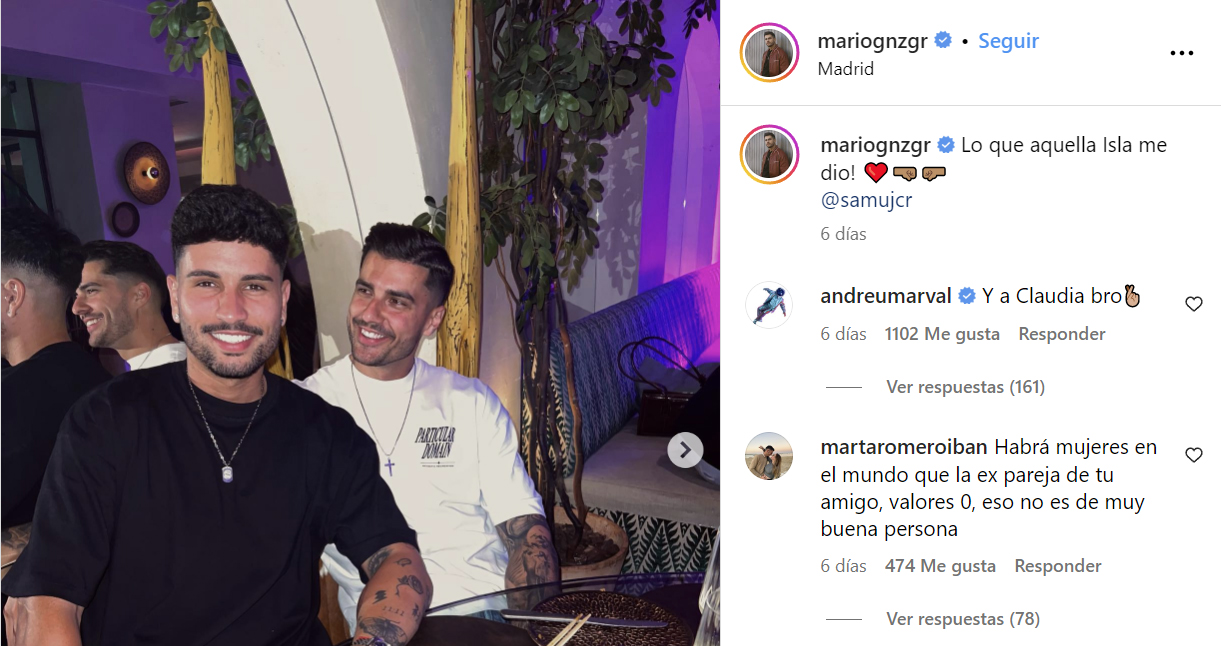 La noticia ha estallado a raíz de un post en el Instagram de Mario. En una foto aparece sonriente junto a Samu, compañero en La isla de las tentaciones 5, con un texto que dice “Lo que la isla me dio”. Andreu, que también participó en aquella edición, le responde con un mensaje demoledor: “Y a Claudia, bro”, confirmando así la relación entre ambos.
