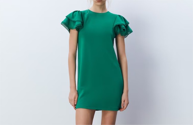 Este vestido se encuentra en color verde, es liso y resalta por el detalle de volantes en su manga corta, lo que le otorga un toque distintivo. Si quieres hacerte con esta prenda, que sepas que aquí es donde vas a poder encontrarla.