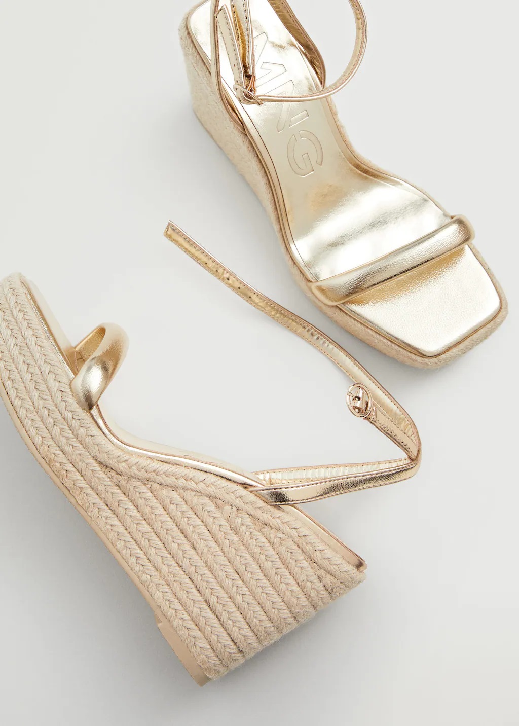 La firma low cost Mango Outlet es consciente del éxito que este complemento tiene cada verano. Por ello nos propone uno de sus modelos más versátiles, unas sandalias con cuña de esparto y tiras en la zona del empeine y alrededor del tobillo.